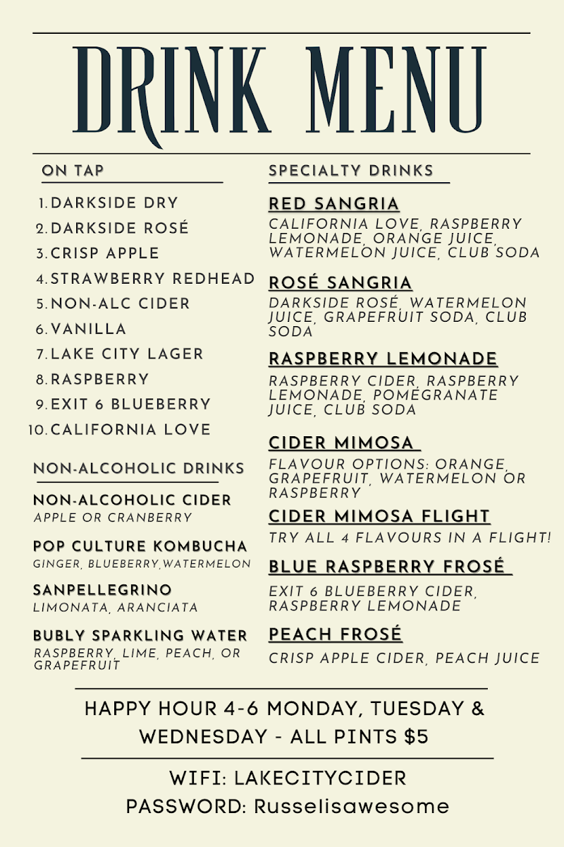 The menu features an array of specialty drinks in addition to their flagship ciders, such as: